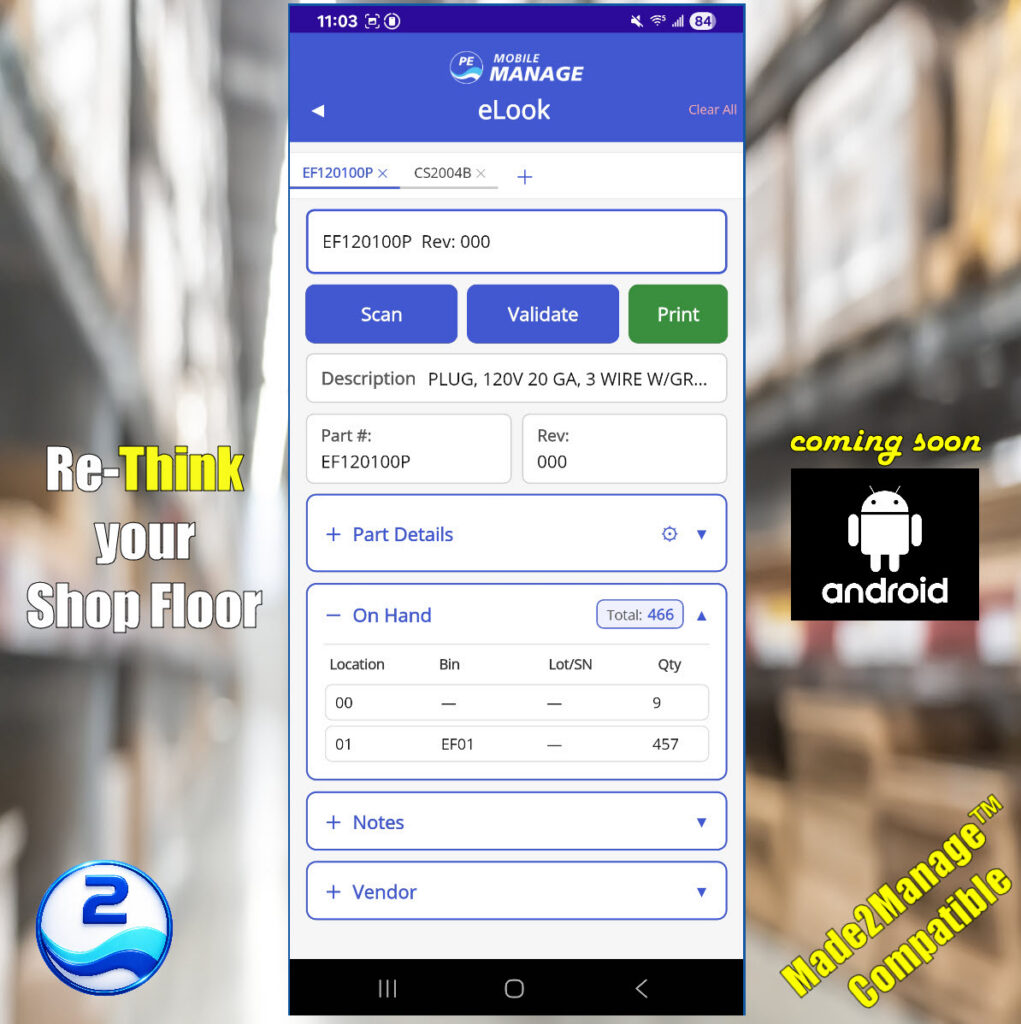 Leveraging the simplicity of Android, with the power of MobileManage for your Shop Floor personnel. Anyone with an Android phone can scan barcodes, query Made2Manage™ data, print labels, take pictures and notify supervisors via text.
